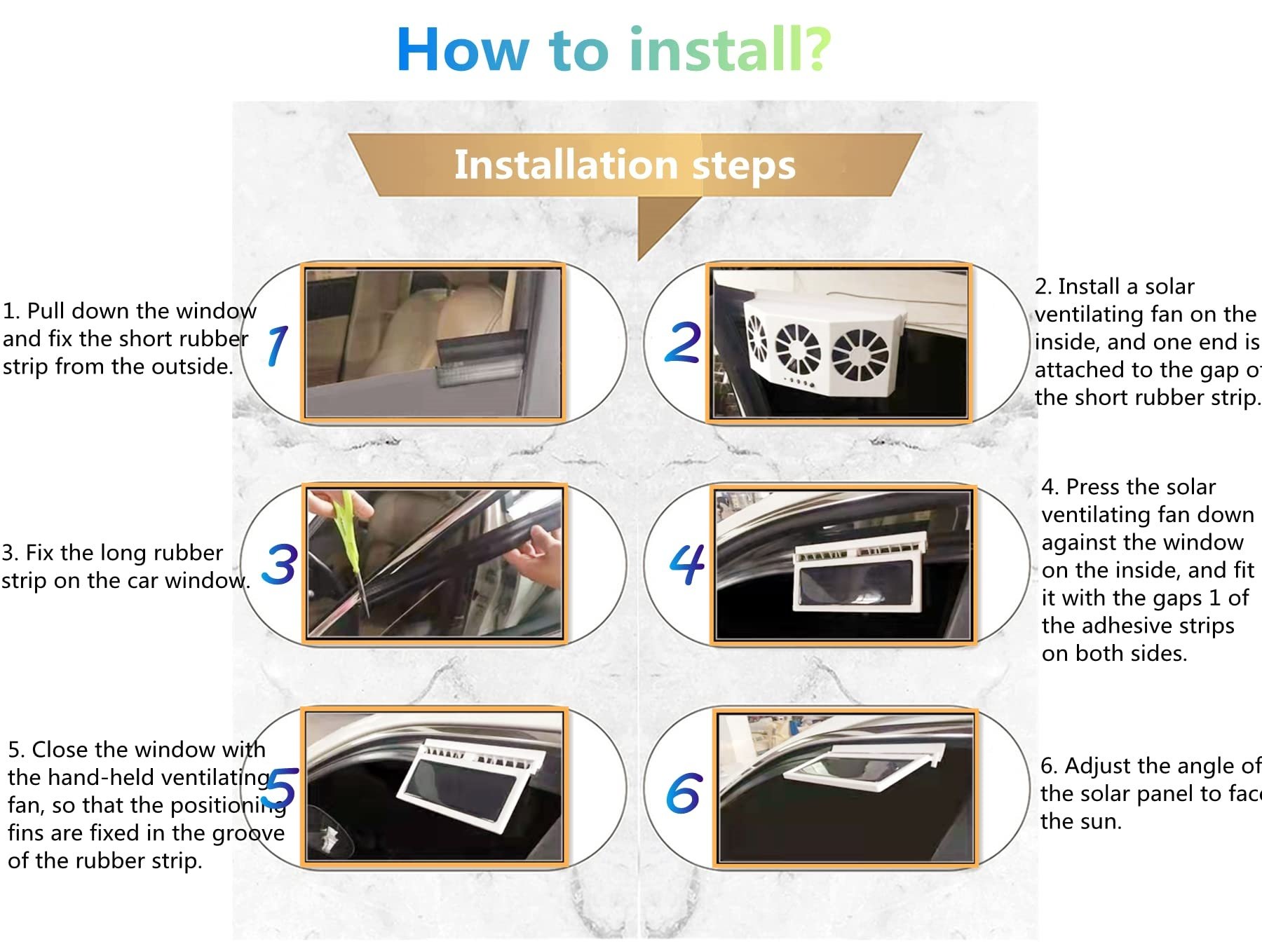 Packing List: 1 * Car solar powered exhaust fan, 1 * Fixde long rubber strip,1 * Fixde short rubber strip, 1 * Manual.